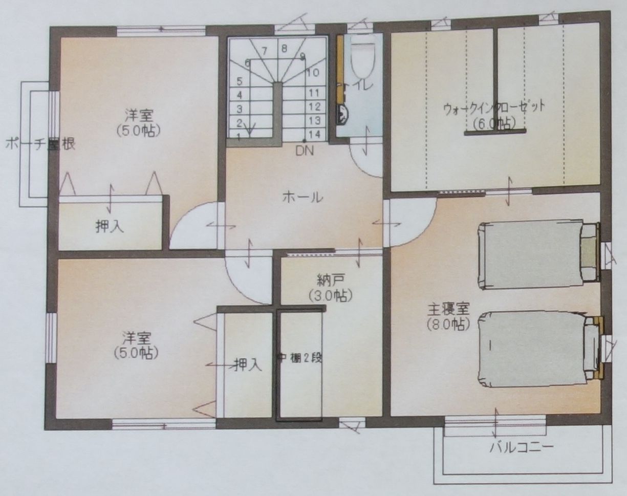 【2階】6畳の広いクローゼットルームと3畳の納戸を設ける。 家の内側 2013年04月20日 2階の間取り 2階には8畳の主寝室と洋室2部屋。そして3畳の納戸と6畳のクローゼットルーム。ついにきた!(`・ω・´)奥さん待望のクローゼットルーム!(`・ω・´)現状、あふれまくってるあの服の数々が全て収納できると思うと涙が出るぜッッ!(TωT)そして服以外の収納の要、納戸っ!(`・ω・´)ここに季節家電やその他雑多なものをまとめて収納するのだ♪( ̄▽ ̄)棚を2段設置してデッドスペースをなるべくなくす。バルコニーはあまり広いのは必要なさそうだったのでコスト削減のために小さめに。北西の洋室だけど元々は↓の形だったが「あれ?こうしたらもっとスペースの有効活用できるのでは?」という土壇場での私の提案で現在の形になった。5畳5畳の洋室が5畳6畳の洋室に広さアップ♪