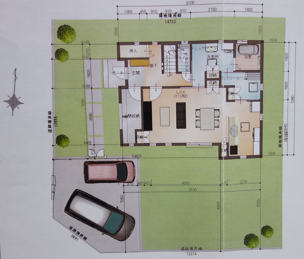 間取りが決定。【1階】ランドリールームと広い土間収納を設ける。 家の内側 2013年04月19日 1階の間取り (外構はイメージ)セオリー通りに南向きにリビングをもってくる。私としては広めの窓を設けて明るさと風通しを確保したかったが奥さんが防犯のために窓は小さめで少ない方がいい、と言う。奥さんは非常に心配性で神経質なのだ(*´・ω・`)これで明るい部屋になるか、風が通りやすいのか・・・心配だぜ?('A`) 北西に玄関。これは担当さんが家相にこだわるためここになった、本当はもう少し南寄りにして駐車場からすぐのところにしたかったのだが(^_^;)玄関を入ってすぐ右手に広めの土間収納。これは靴の数が多いため。現時点で70足はあるからそれを全部収納しようと思ったらこうなった(笑)今のコーポでは下駄箱に入りきらずクローゼットや洋室に靴が点在しているのだ( ̄□ ̄;)私が花粉症のため花粉の時期は外に洗濯物を干せないためランドリールームを設ける。ここに洗濯物を干して、そのまま畳むことや家事などができるカウンターを設置。そして収納を多めに設ける。部屋がごちゃごちゃしてくるのは収納ができないから。という理由で収納は多めがいい。奥さんは神経質なので部屋に物が散乱することが許せない。私も部屋はスッキリさせておきたいのでここは賛成( ̄▽ ̄)キッチンはI型。最初はアイランド型やL字型を計画していたがどんどん妥協してこのように('A`)